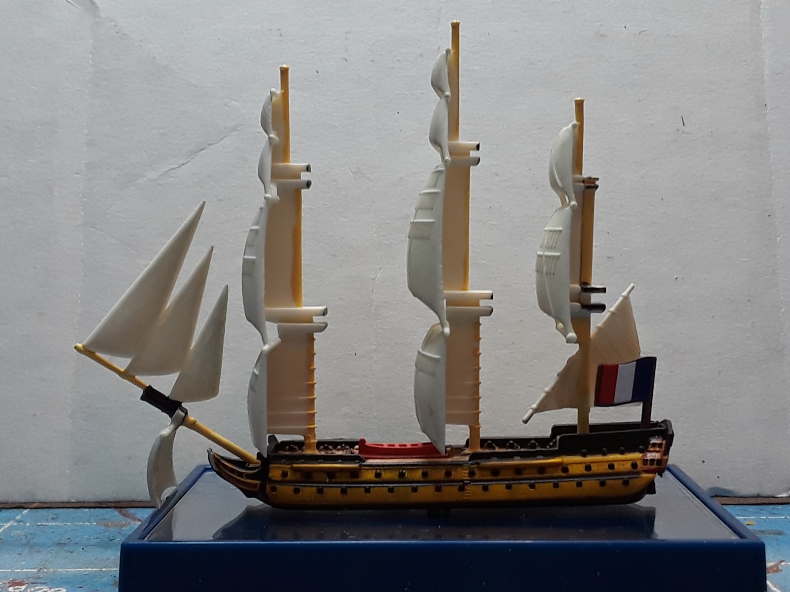 Spars set in front of the mast, always! The way they are cast the ships can only be modelled with a following wind from directly astern. A very inefficient sailing configuration. And by casting the spars flush, they can't even be separated and repositioned on the mast without destroying either the spars or the masts.